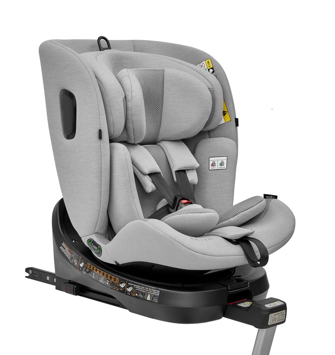 Наличие вращающегося на 360 градусов основания делает удобным пристегивание и отстегивание ребенка. Для установки кресла в салоне применяются крепления Isofix и регулируемый упор в пол. Обивку можно снять и постирать в машинке при температуре не более 30 градусов. Модель соответствует стандарту I-Size.