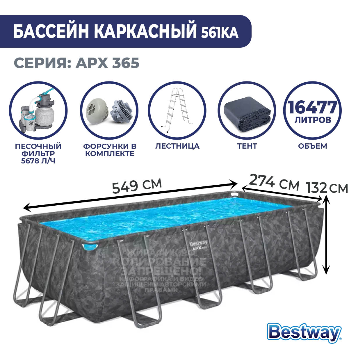 BestWay Power Steel 561KA – это большой каркасный бассейн прямоугольной формы для отдыха всей семьи или компании друзей. Он имеет надежную сборную конструкцию и состоит из металлического каркаса, а также мягкой чаши из армированного трехслойного ПВХ. Конструкция чаши бассейна позволяет использовать его не только летом, но и зимой. Каркас изготовлен из нержавеющей стали и имеет специальное покрытие Framelink, защищающее его от ржавчины. Чаша бассейна TriTech изготовлена из прочного трехслойного материала, он на 15% более устойчив к разрыву, на 33% более устойчив к растяжению и на 83% более долговечен.