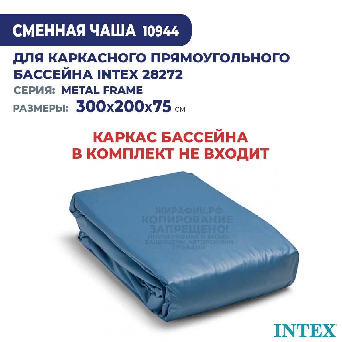Intex 10944 – чаша для каркасных бассейнов серии Rectangular Frame размерами 300х200х75 см. Для ее изготовления использовался армированный материал, состоящий из 3 спаянных слоев – двух ПВХ и сетки из полиэстера. Это придает ему прочности и износостойкости. В чаше выполнен сливной клапан и отверстия для установки фильтрующего оборудования.