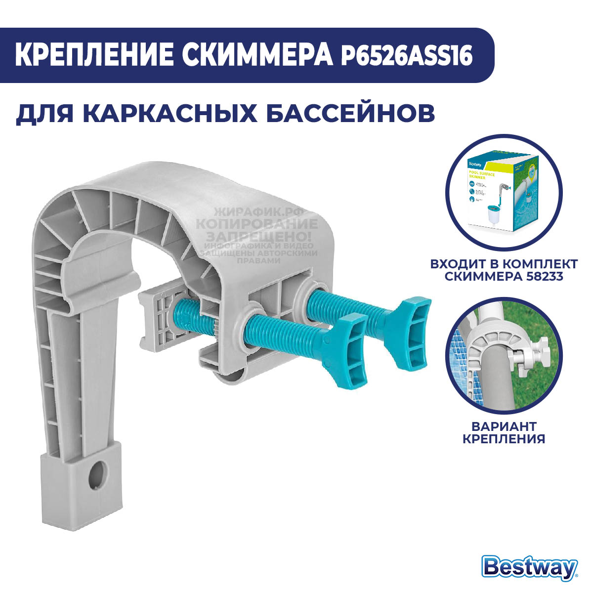 Bestway P6526ASS16 – крепление для скиммеров Bestway 58233 и 58237. С его помощью можно зафиксировать скиммер на бортике бассейна. Скиммер позволяет улавливать плавающий в воде мусор и не позволяет ему пройти в насос. Если ваш бассейн стоит в окружении деревьев - то все упавшие с них листья обязательно окажутся в скиммере и вам не придется постоянно вылавливать их сачком. Оригинальное крепление выполнено из высококачественного пластика. Оригинальное крепление выполнено из высококачественного пластика.
