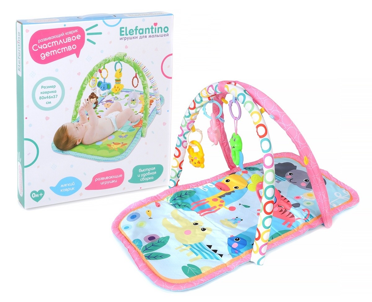 Игровой коврик Elefantino IT106282 имеет мягкую игровую зону для новорожденных, украшенную ярким рисунком. Над ней устанавливается 2 безопасные дуги с подвесными игрушками в виде погремушек и прорезывателя. Дуги снимаются при необходимости.