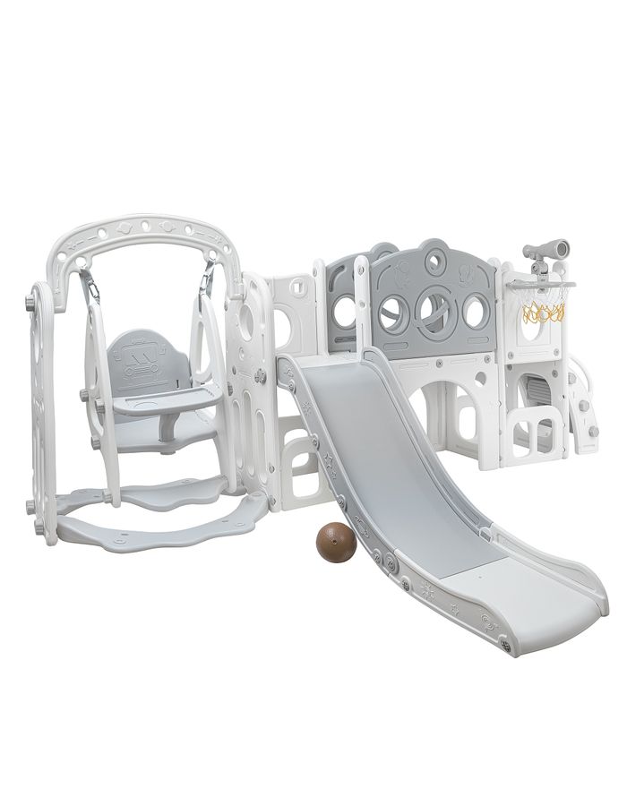 Детский игровой комплекс Pituso «Little Prodigy» рассчитан на детей в возрасте от 3 лет. Он состоит из горки, качели, мостика, баскетбольного кольца и подзоной трубы. Высота качелей регулируется в двух положениях. На горку ведут нескользящие ступеньки.