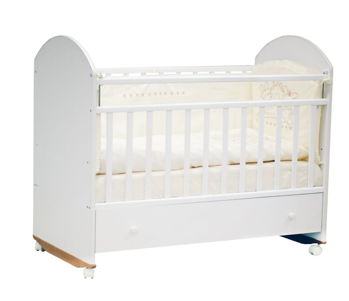 Изделие выполнено из массива березы, покрытого гипоаллергенным лаком. Передняя стенка опускается. Ортопедическое днище регулируется по высоте в 2-х положениях. Под ним расположен выдвижной ящик для постельных принадлежностей. Для удобства перемещения кроватки имеются колесики.