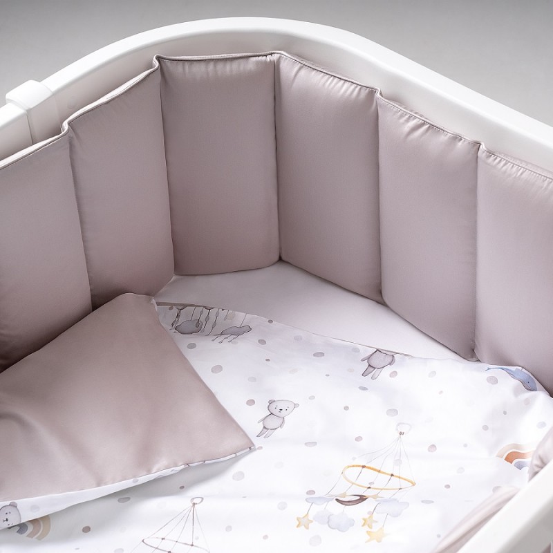 Изделия выполнены из премиальной сатиновой ткани (сатин ТС300), а в качестве наполнителя используется холлкон. Крепятся к кроватке при помощи лент-завязок. Чехол съемный на молнии.