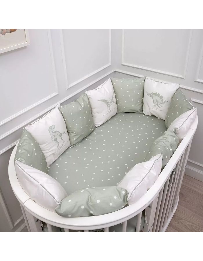 Комплект детского постельного белья Lappetti «Дино сафари» 6150 предназначен для кроватки прямоугольной и овальной формы. Он состоит из 6 предметов – подушки, одеяла, наволочки, пододеяльника, простыни без резинки и бортика из 12 подушечек со съемными чехлами.