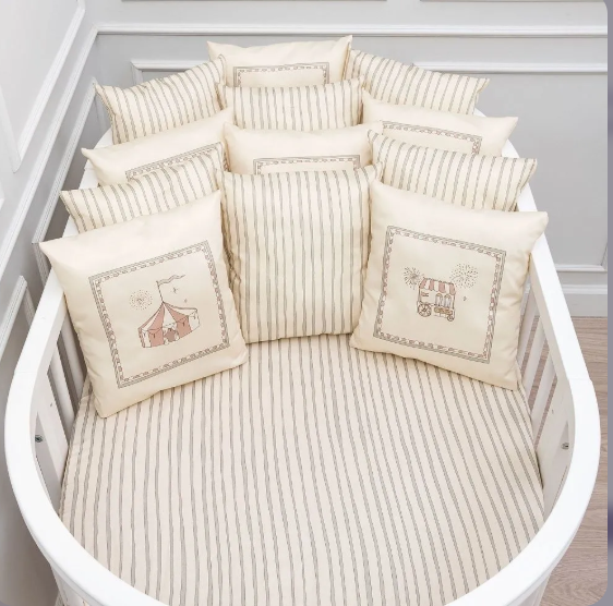 Комплект включает в себя наволочку, пододеяльник и простынь, бортик из 12 подушек, одеяло и подушку. Отличительные черты постельного белья от Lappetti – это ровные и прочные швы, строгое соответствие указанным размерам и безукоризненный крой. Данное постельное белье станет отличным украшением кроватки вашего малыша.