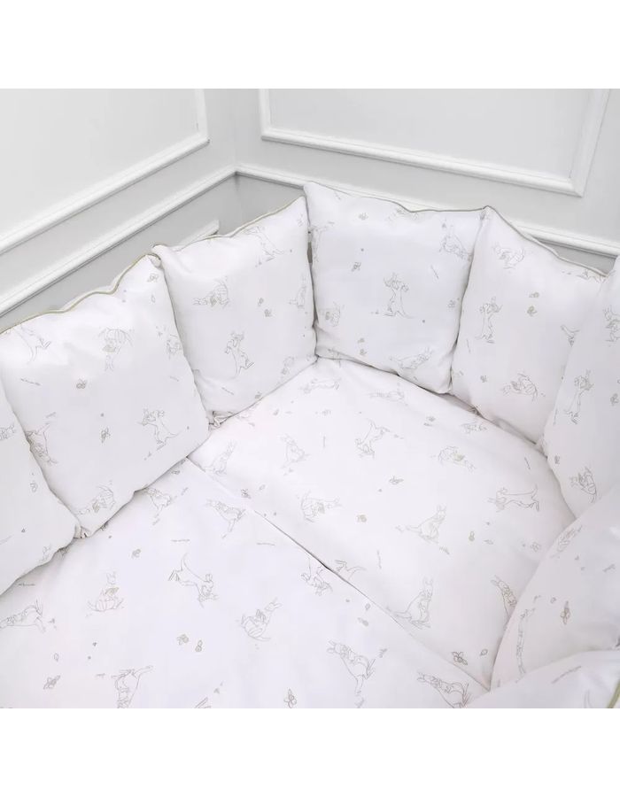 Комплект включает в себя подушку, одеяло, наволочку, пододеяльник, простынь на резинке и бампер из 12 подушек со съемными чехлами. Отличительные черты постельного белья от Lappetti – это ровные и прочные швы, строгое соответствие указанным размерам и безукоризненный крой. Данное постельное белье станет отличным украшением кроватки вашего малыша.