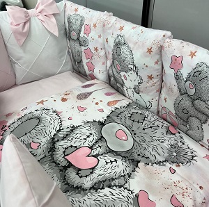 Комплект в кроватку Премиум Панно «Мишка Тедди» от торговой марки Подушкино состоит из 6 предметов и рассчитан на круглые, овальные и прямоугольные кроватки с габаритами спального места 120х60 см. По краям ребенка защищает бортик, состоящий из 12 мягких подушечек, которые имеют съемные наволочки и при помощи лент крепятся к бортику. 4 подушечки украшены аппликацией «Панно».