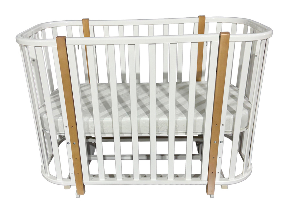 Антел Esenia-2 – кровать 3 в 1, имеющая 3 варианта сборки: овальная кровать, овальный манеж и диван. Модель оснащена поперечным маятником для укачивания. Передняя стенка имеет 2 положения высоты.