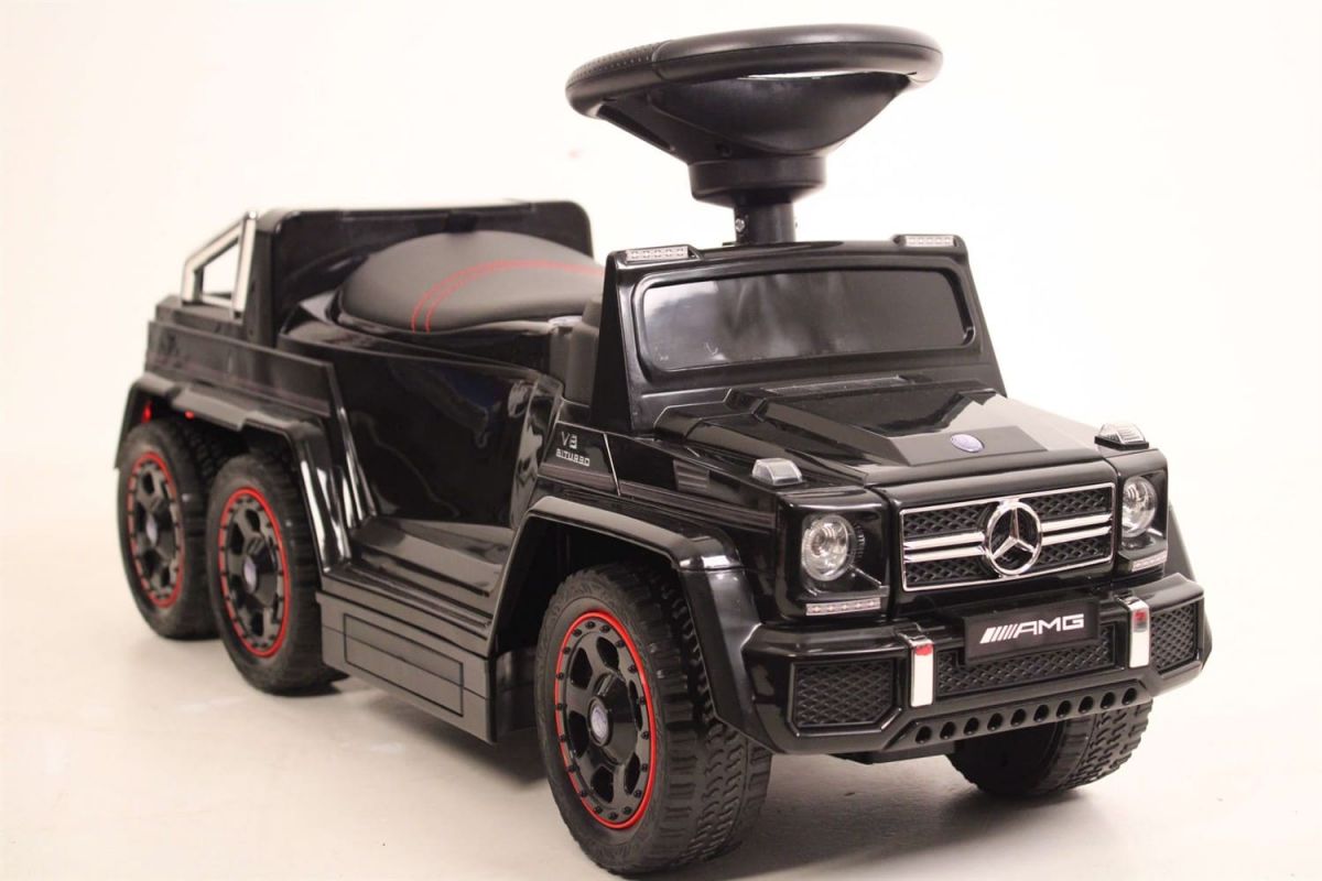 RiverToys Mercedes-Benz A010AA-D (ЛИЦЕНЗИОННАЯ МОДЕЛЬ) – детская каталка, представляющая собой лицензионную модель внедорожника Мерседес G63 с колесной формулой 6х6. Модель оснащена удобным кожаным сидением и мягкими каучуковыми колесами. Позади основного сидения расположен багажник для мелочей и игрушек. Его можно преобразовать в еще одно сидение и кататься вместе с другом.