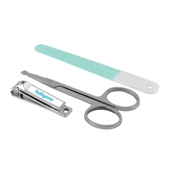 Маникюрный набор BabyOno 068 включает в себя ножницы, щипчики и пилочку. Кончики ножниц закруглены, чтобы не уколоть ребенка, а пилочка мелкозернистая, поэтому не поцарапает малыша. Изделия выполнены из качественного пластика и нержавеющей стали.