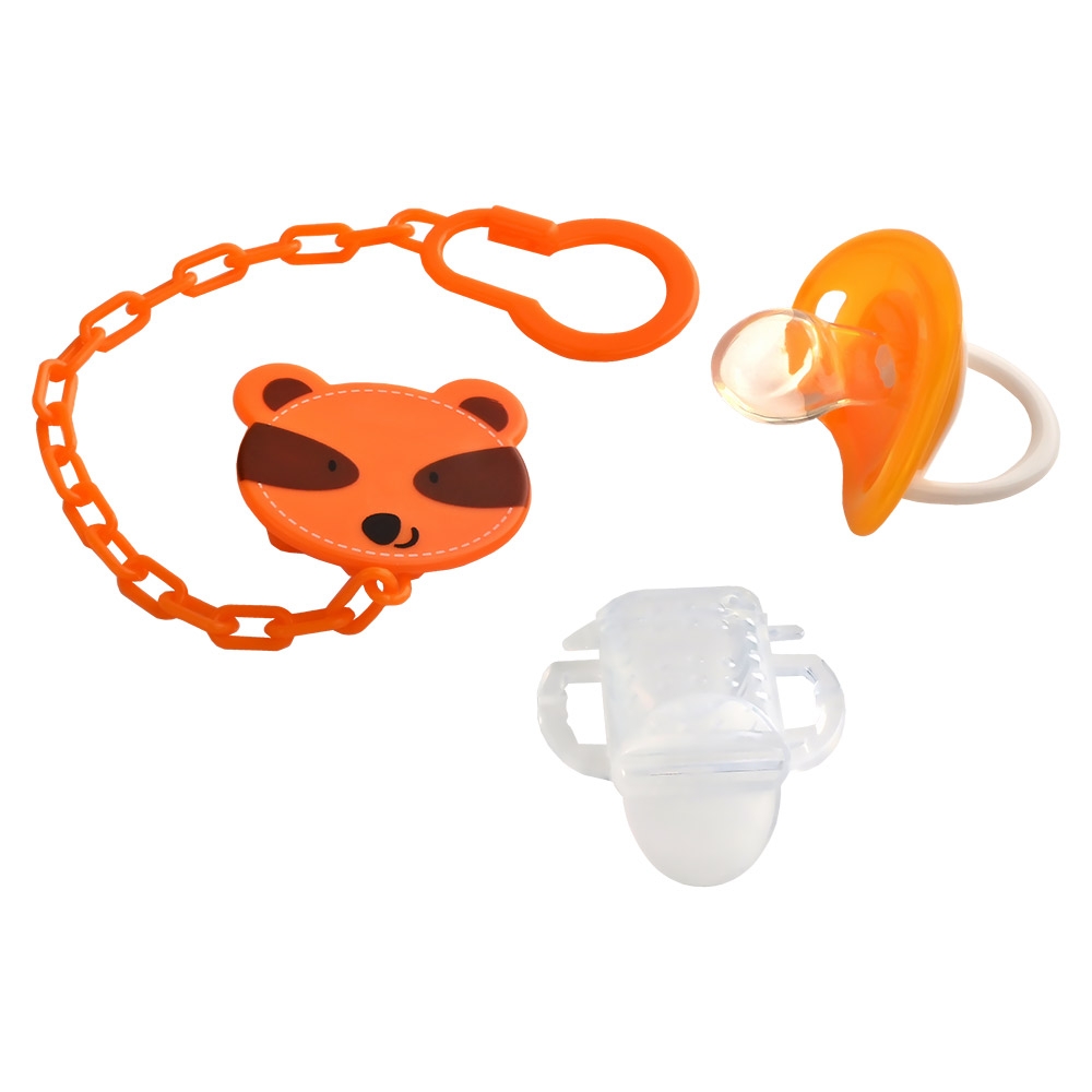 Нагубник выполнен из полипропилена и оснащен вентиляционными отверстиями. В комплекте поставляется держатель для пустышки на цепочке.