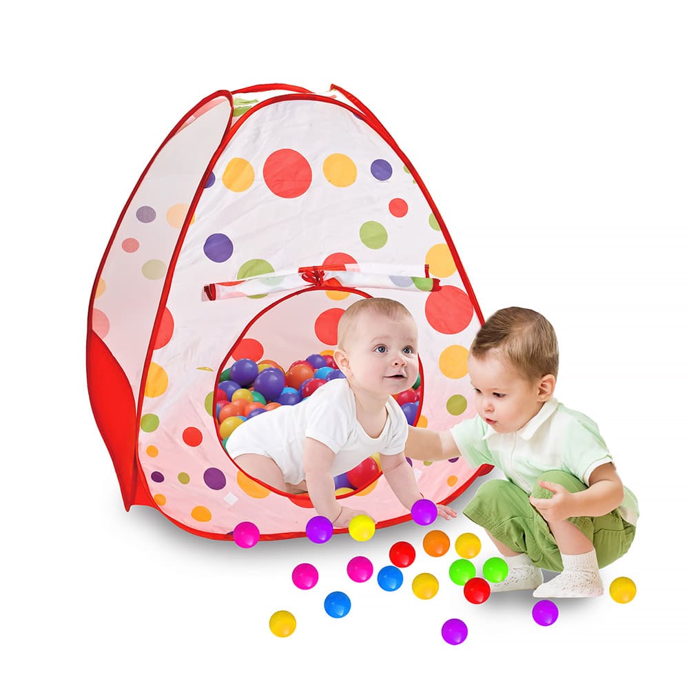 Палатка украшена рисунком. Изделие имеет компактные габариты в сложенном виде, поэтому его легко перевозить. В комплекте поставляется 100 пластиковых разноцветных шариков.