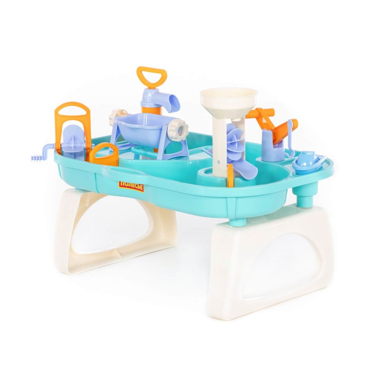 Полесье Водный мир №5 – детский набор для игры с водой. Он включает в себя емкость для воды, две водяные мельницы, запускаемые потоком воды, насос, при помощи которого вода накачивается в ковшик (для опорожнения он опрокидывается), заслонки для регулировки потока воды и подъемный кран, позволяющий эвакуировать лодку. Игры с брызгами в компании друзей – отличный способ весело провести время.