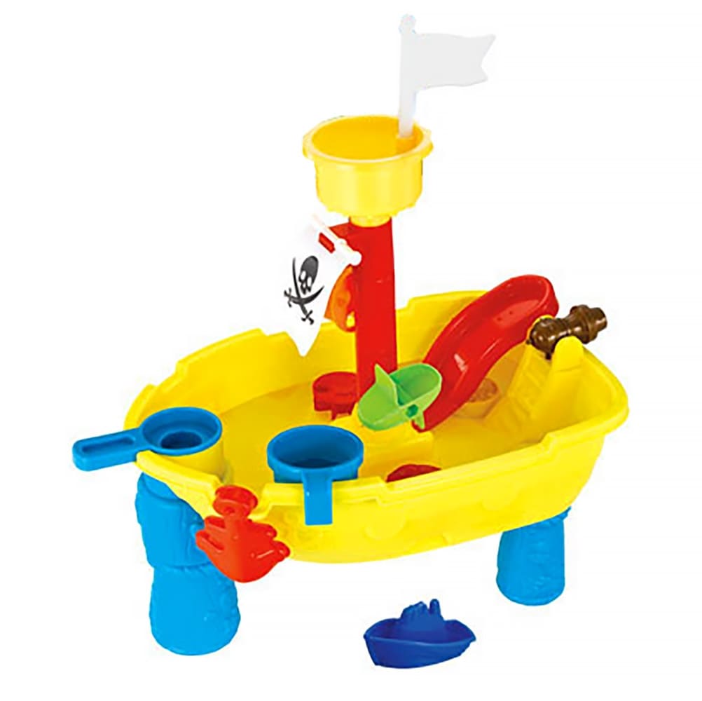 Игровая панель представляет собой емкость сложной формы. Нижние выемки заполняются песком или водой. Все составляющие набора выполнены из пластика. Столик подходит для игры на свежем воздухе и в помещении.
