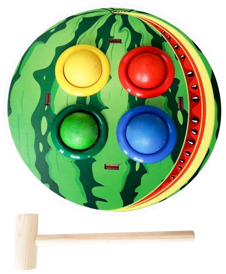 Стучалка цветная «Арбуз» 115304 представляет собой развивающую игрушку, предназначенную для детей в возрасте от 3 лет. В набор входит деревянный корпус в виде арбуза с 4 отверстиями, а также 4 цветных шарика и молоточек.