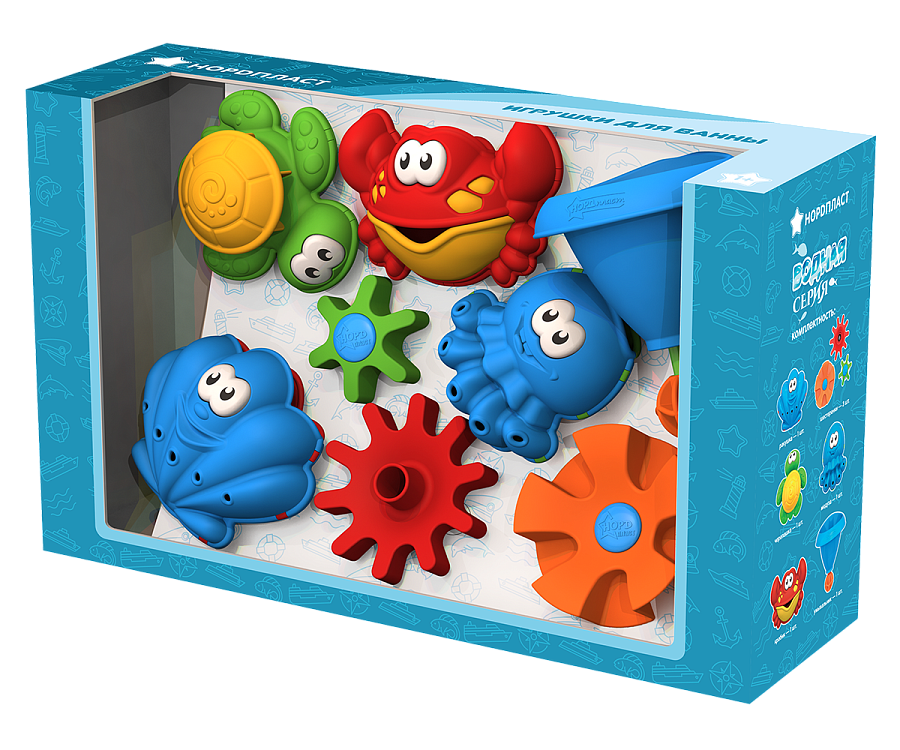 Набор игрушек для ванной «Водная серия» обязательно понравится малышу и превратит обычные водные процедуры в увлекательное приключение. Стоит налить в обитателей водного мира воды и благодаря отверстиям в игрушках, из них польются струйки воды, а если на панцирь черепашки направить напор воды, панцирь начнет крутиться, так же в набор входят шестеренки и умывальник, соединив шестеренки друг с другом и направив на одну из них напор воды, все шестеренки закрутятся. Благодаря присоске на задней части игрушек, их можно закрепить на любой гладкой поверхности. Прочный безопасный пластик, яркие цвета, которые не тускнеют со временем, четкая деталировка.