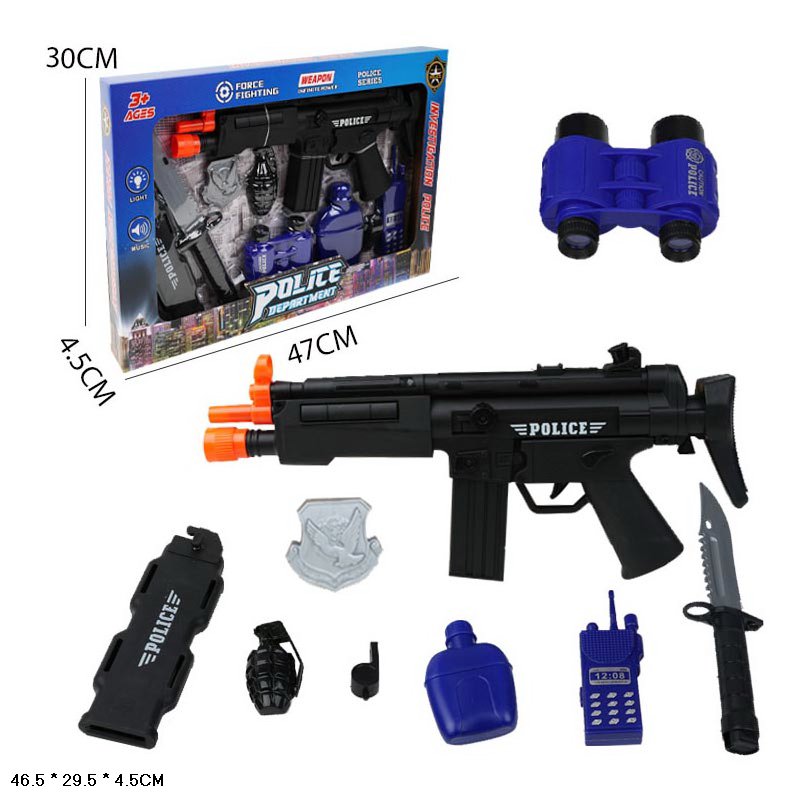 Стильный набор представляет собой игровое оружие и все необходимые аксессуары военного. Игрушечный пистолет создан для тренировки меткости, реакции, внимания и сосредоточенности самых маленьких игроков. С таким набором ребенок сможет почувствовать себя настоящим полицейским и придумать много сюжетно-ролевых игр с друзьями. В набор входит: игрушечный пистолет, бинокль, рация, ножик, граната, свисток, жетон полицейского и другие аксессуары.