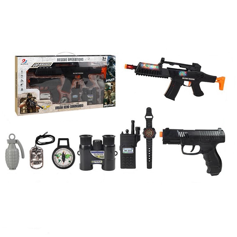 Стильная модель представляет собой игровое оружие, которое отлично подходит для тренировки меткости, реакции, внимания и сосредоточенности самых маленьких игроков.Модель тщательно проработана и выполнена из высокопрочного пластика и в стильном цвете и дизайне. Игрушечный автомат имеет эргономичную рукоятку и световые эффекты. Игрушку удобно держать в руках и имитировать стрельбу. В наборе есть игрушечный пистолет, рация, бинокль и дополнительные аксессуары.