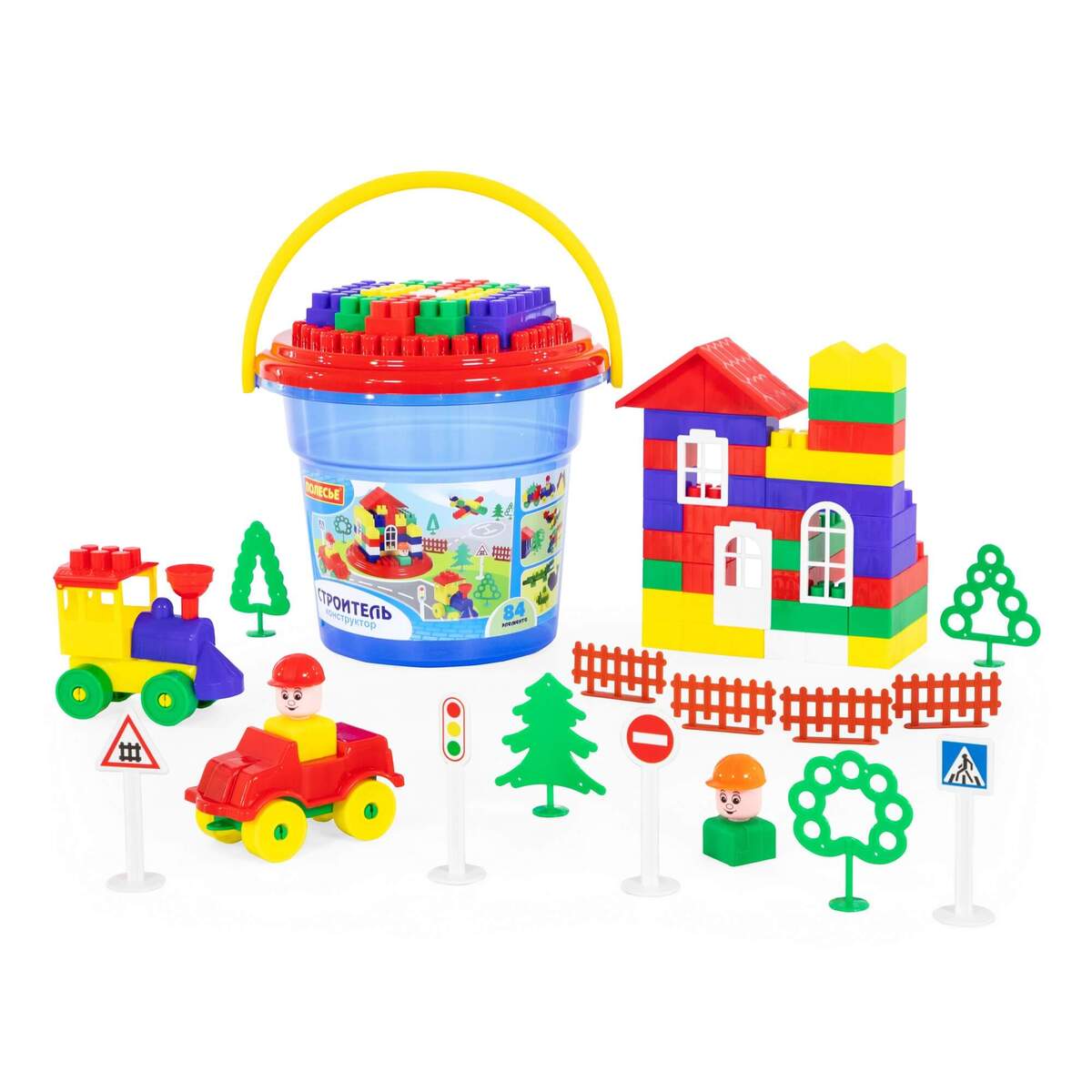 Конструктор Полесье «Строитель» 37213 включает в себя 84 игровых элемента, упакованных в прозрачное пластиковое ведерко с крышкой и ручкой.