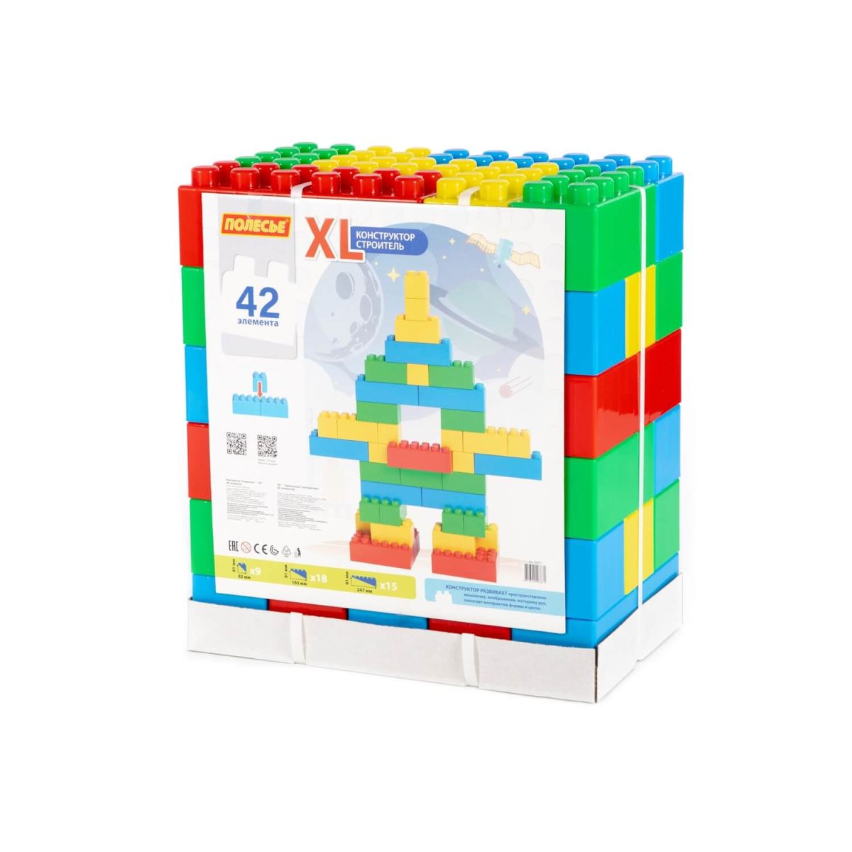 Полесье XL 93671 – строительный конструктор, состоящий из 42 безопасных пластиковых элементов. Блоки отличаются расцветкой (желтая, красная, голубая, зеленая) и геометрической формой (квадратные и прямоугольные).