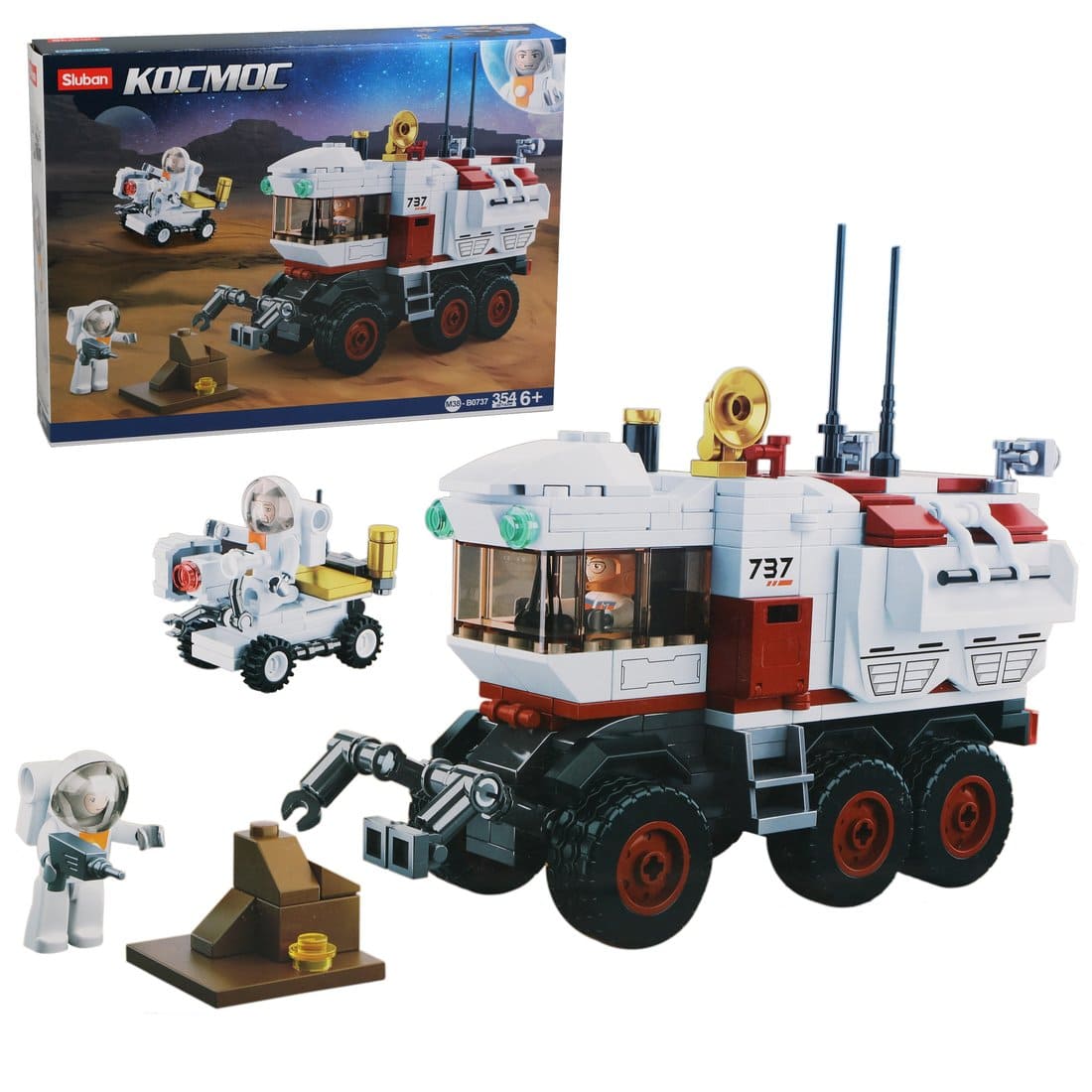 Конструктор Sluban «Исследователи» из серии «Космос» состоит из 354 деталей и предназначен для детей от 6 лет. Из них можно собрать космический аппарат на колесах и отправиться исследовать бесконечное пространство Вселенной. Все элементы легко соединяются между собой и выполнены из прочного пластика.