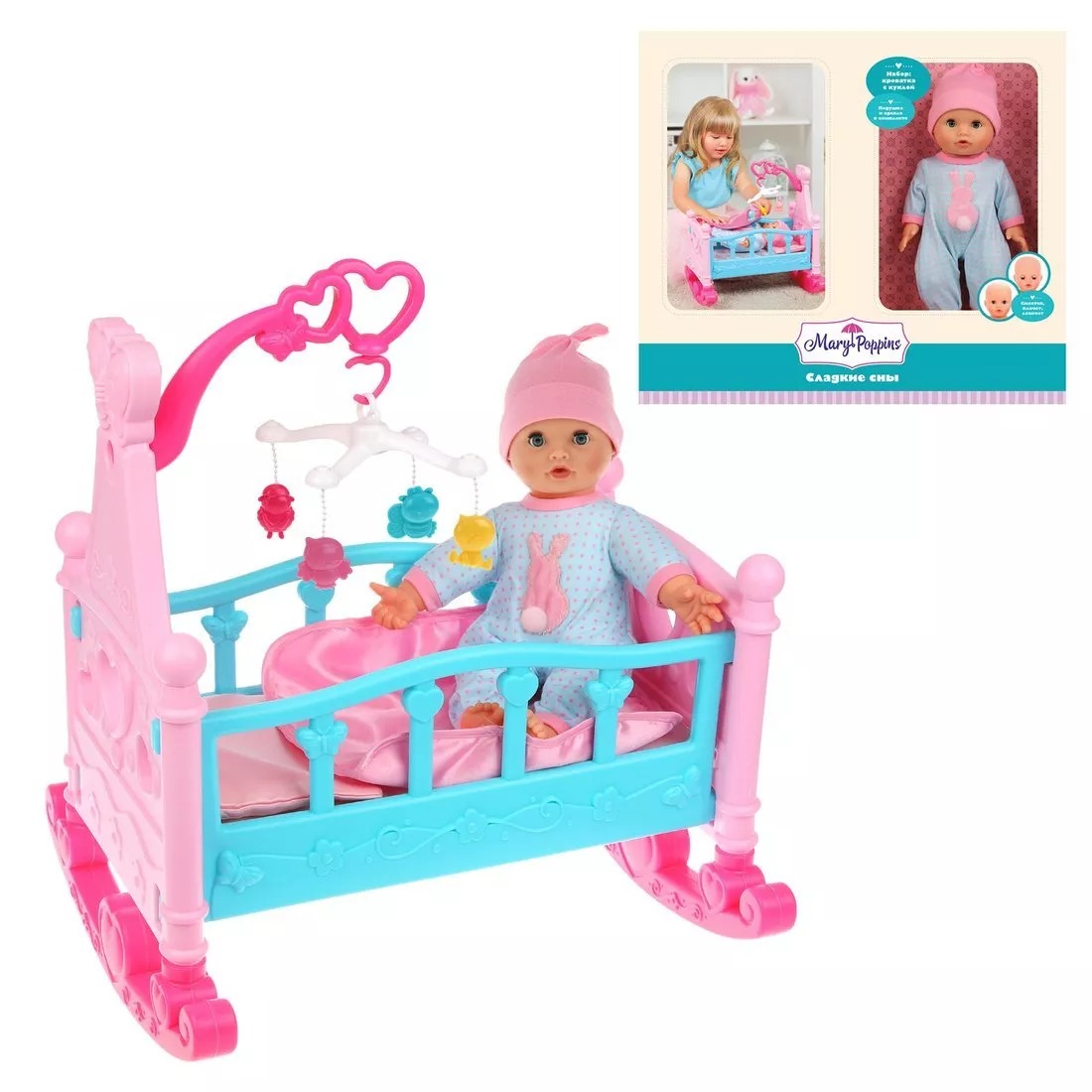 Игровой набор Mary Poppins «Сладкие сны» 67392 включает в себя куклу, кроватку-качалку с мобилем, подушку, матрас и одеяло. Кукла имеет мягконабивное тело. Если нажать ей на животик, она начнет лепетать, а в лежачем положении закрывает глазки и засыпает.