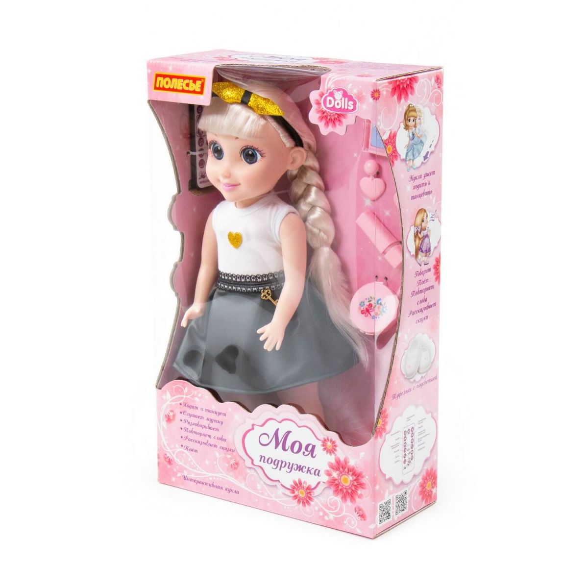 Игрушка умеет разговаривать, петь песни, повторять слова, рассказывать сказки (Репка, Теремок, Курочка Ряба, Колобок, Лиса и журавль, Лисичка-сестричка, Коза-дереза), а также ходить и танцевать. Туфли куклы подсвечиваются. В комплект входит 5 аксессуаров, позволяющих играть в салон красоты, а также анкета подружки.