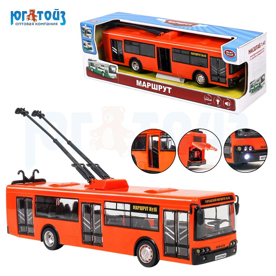 Троллейбус оснащен подвижными «рогами» открывающимися дверьми, багажным отсеком и инерционным механизмом движения. Он имеет световые и звуковые эффекты - при открытии дверей включается подсветка, музыка и воспроизводятся фразы на русском языке. Изделие выполнено из пластика.