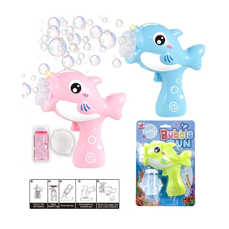 Пистолет-мыльные пузыри Дельфин. При каждом нажатии на кнопку, пистолет будет выбрасывать большое количество мыльных пузырей, что обязательно приведет в восторг любого ребенка. Бутылочка с мыльным раствором входит в комплект, для того чтоб запустить мыльные пузыри, необходимо раствор вылить в специальную чашку и опустить дуло пистолета в него и нажать на курок. Раствор для мыльных пузырей абсолютно безопасен в использовании. Мыльные пузыри отлично подходят для игр на улице. Пистолет работает от 2-х батареек типа АА (в комплект не входят).
