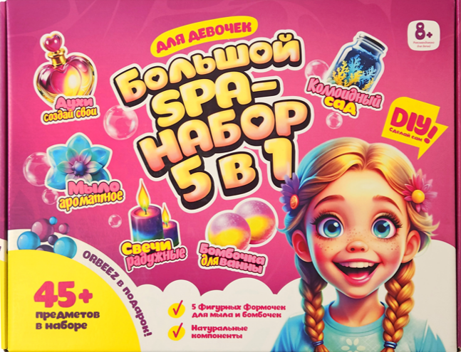 Большой Спа набор поможет девочкам в приобретении навыков изготовления свечек, духов, мыла, бомбочек для ванны и коллоидного сада.