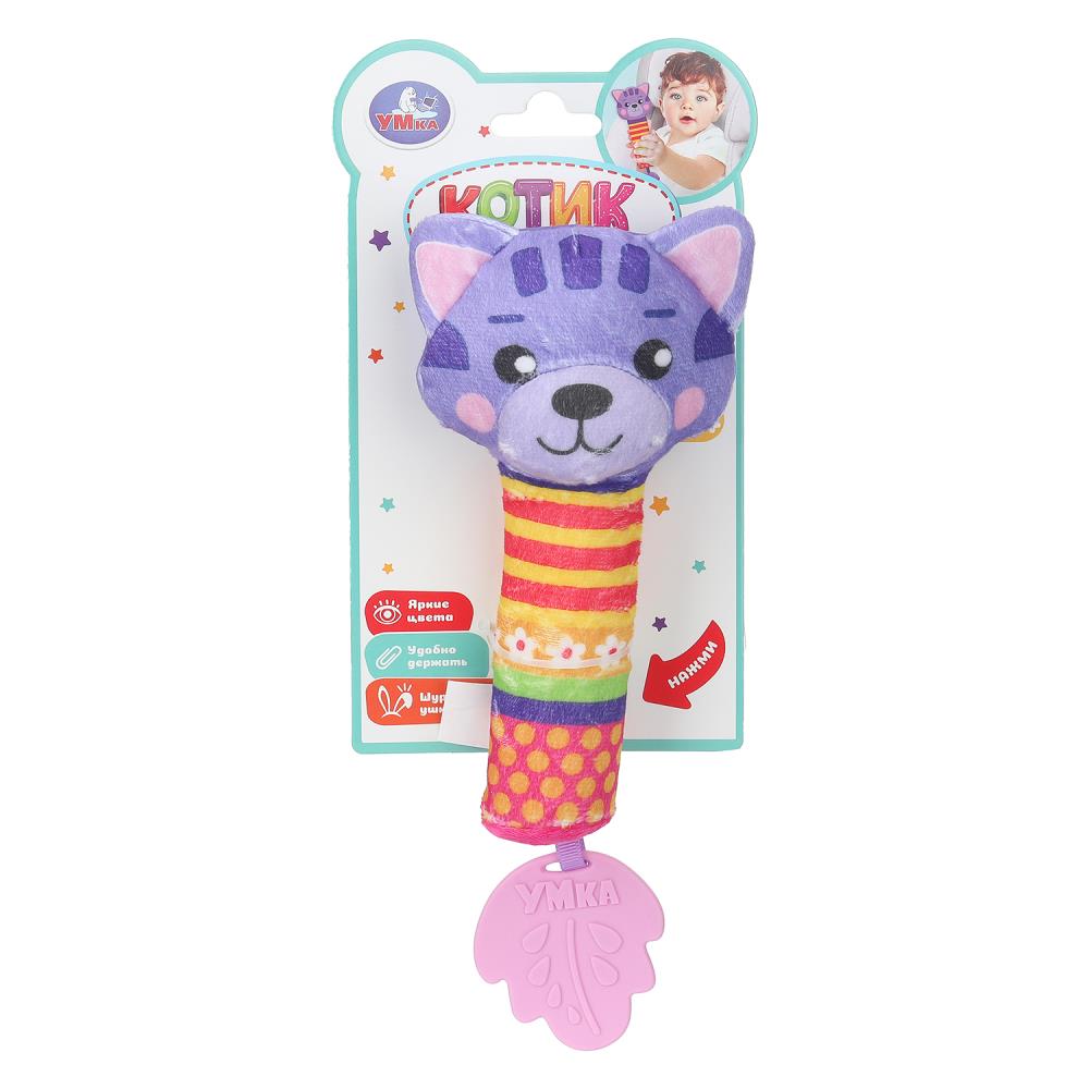 Игрушка в виде забавного котёнка выполнена из очень мягкого и гипоаллергенного материала красочной расцветки. При нажатии игрушка издаёт забавный пищащий звук, а если её потрясти - весело загремят шарики, надежно спрятанные внутри. Прорезыватель интересной формы из качественного безопасного материала пригодится малышу, когда у него будут резаться зубки.