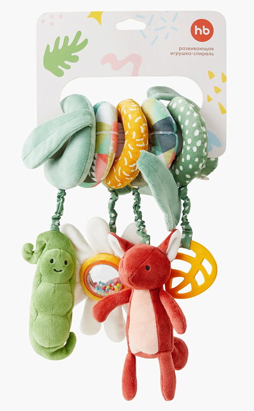 Игрушка-спираль – настоящий развивающий центр. Мягкая, необычной формы, сжимается и разжимается – малышу будет интересно познавать её свойства, различать на ощупь разнообразие материалов, рассматривать цвет и фактуру тканей, из которых она изготовлена. Подвески в виде лисички и горошка с добрыми мордочками станут верными друзьями ребёнка. Наблюдение за подвижными частями поможет научиться удерживать взгляд на предмете. Листочек с отверстиями приятно трогать и грызть. Спираль легко подвесить на коляску, в кроватку или автомобиль. Игрушка прочная и гибкая, легко поддаётся малышу, когда он тянет её к себе и возвращается в исходное положение, когда отпускает.