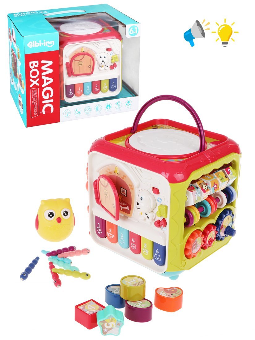 Развивающая игрушка Наша игрушка Куб 648А-58 имеет световые и звуковые эффекты. У кубика 6 сторон, на каждой из которых расположены развивающие элементы: