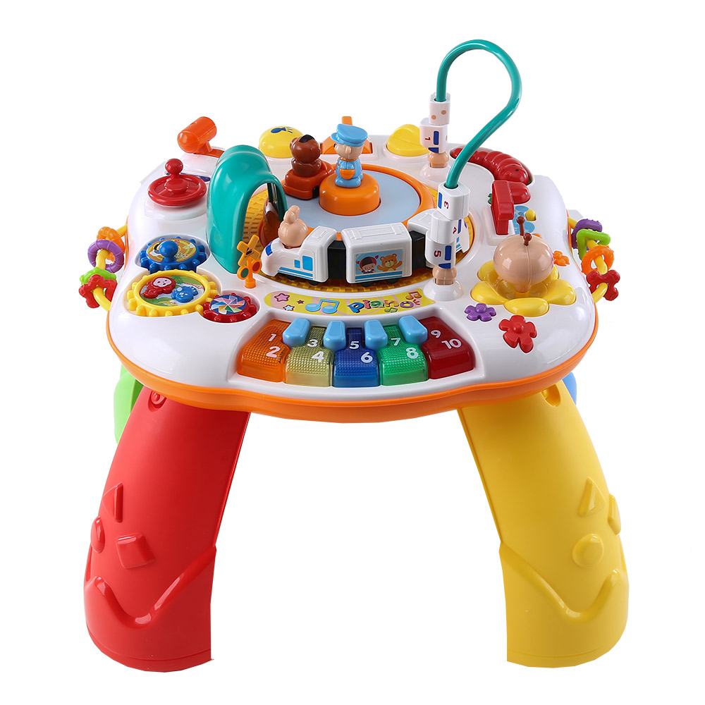 Столешница оснащена развивающими элементами (рычаги, погремушки, машинка, паровозик). Под музыкальной панелью расположена ниша для хранения мелочей. Игрушка подвешивается на спинку кровати. Изделие выполнено из пластика и требует для работы батареек.