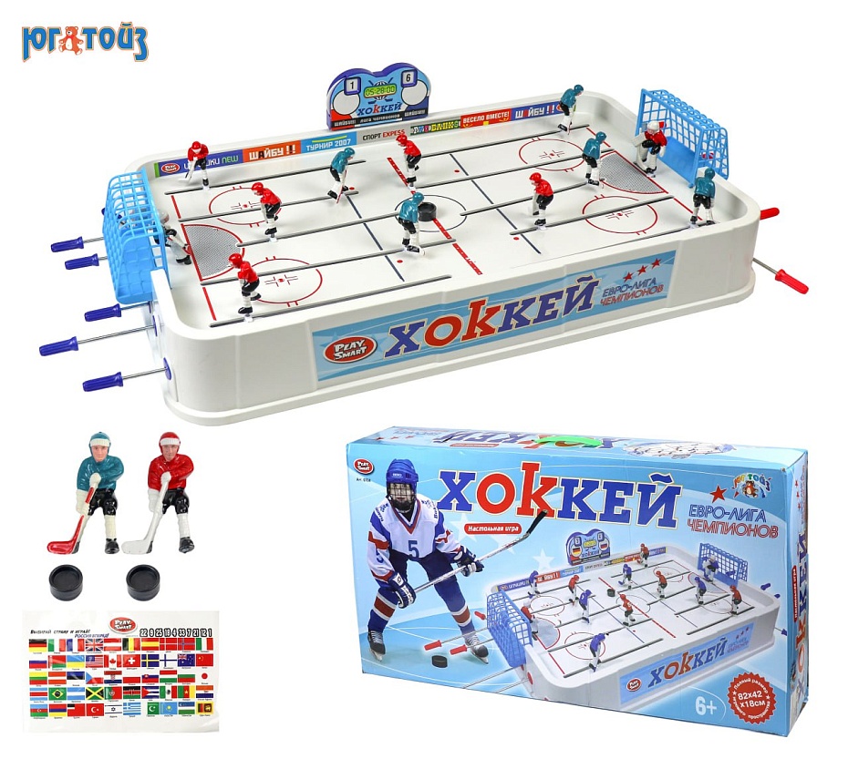 Настольная игра Хоккей с металлическими клюшками. Настольная игра для 2-6 человек, в каждой команде, как и в настоящем хоккее, пять полевых игроков и вратарь, управление каждым игроком индивидуальное. Для придания игре реалистичности на бортах наклеены рекламные баннеры. В каждой команде есть по одному запасному игроку, и в любой момент для усиления игры можно произвести замену.
