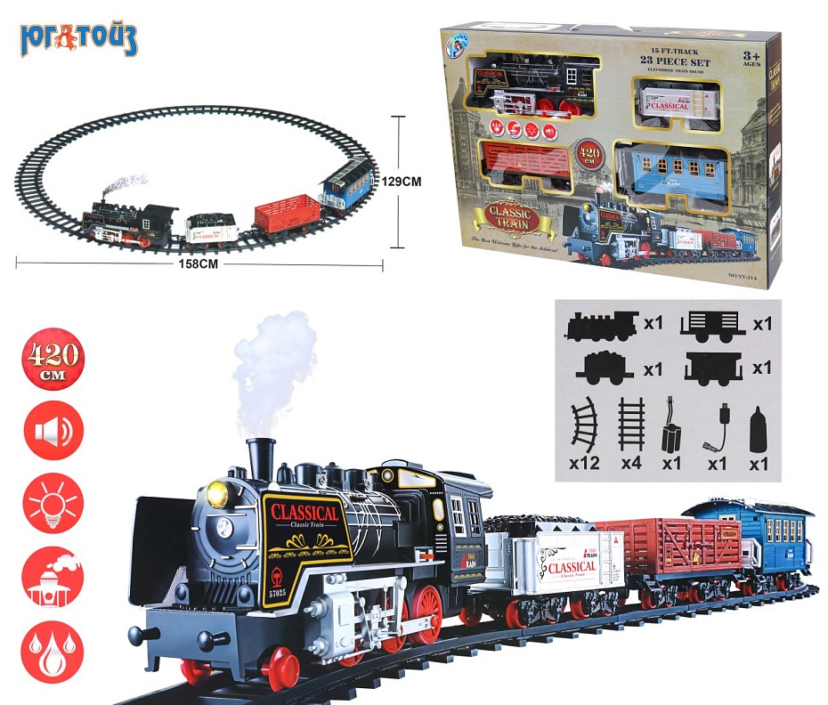 Игрушка железная дорога для всех маленьких любителей поездов. В комплекте есть детали для сборки дороги, локомотив, пассажирский вагон, вагон с углем и грузовой. Все элементы дороги выполнены в невероятно реалистичном дизайне с большим вниманием к деталям. Двигаясь по рельсам, поезд будет выдавать характерные звуки, такие как стук колес и гудки оповещающие о его прибытии. Кроме того, пассажирский состав может освещать себе дорогу и выпускать дым. Игрушка работает 2-х батареек типа ААА (в комплект не входит).