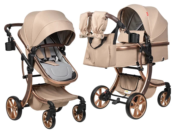 Коляска-трансформер Farfello Aimile New Gold – это стильное и функциональное решение для родителей, ценящих удобство и комфорт. Выполненная на элегантной золотой раме, она сочетает в себе практичность и изысканный дизайн.