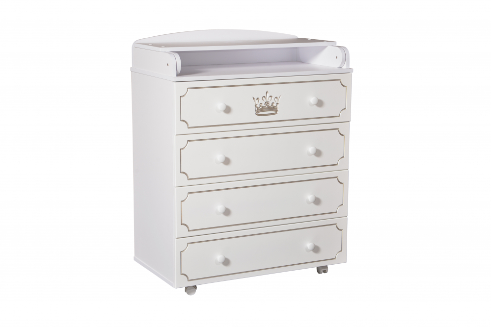 Детский комод Антел Nikol 800/4 МДФ оснащен 4 выдвижными ящиками на шариковых направляющих, в которых можно хранить детские вещи и постельные принадлежности, а также откидным пеленальным столиком. Для быстрой и удобной транспортировки комода есть 4 колесика. Изделие выполнено из высококачественных и экологически чистых материалов – ЛДСП и МДФ. Фасад украшен фрезеровкой в виде короны.