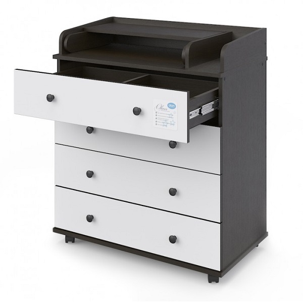 Пеленальная крышка раскладная со скрытым креплением. Возле пеленального столика есть отделение для принадлежностей по уходу за ребенком. Для удобства перемещения комода предусмотрены колесики со стопорным механизмом.