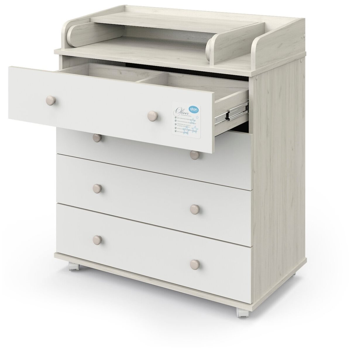 Атон Орион Oliver 80/4 ЛДСП – удобный комод для пеленания малыша. Он имеет цельное основание, 4 выдвижных ящика с шариковыми направляющими, которые продлевают срок службы механизма, отличаются плавным и бесшумным ходом. Верхний ящик разделена на 2 отделения. Дно ящиков выполнено из ХДФ.