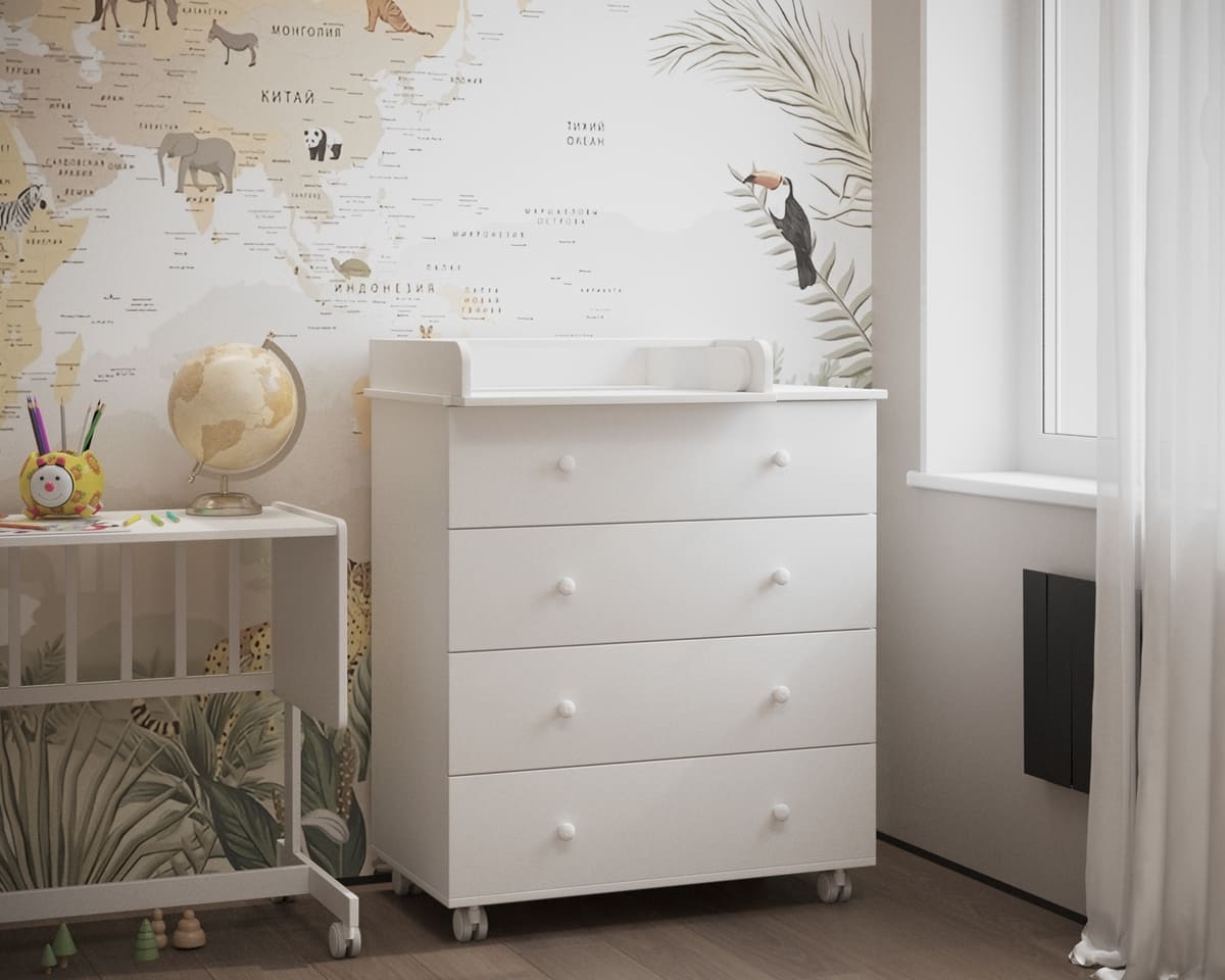 Пеленальный столик полностью демонтируется, превращая комод в классическую модель. Благодаря прорезиненным колесикам комод легко передвигается, что делает уборку комнаты удобной и быстрой.