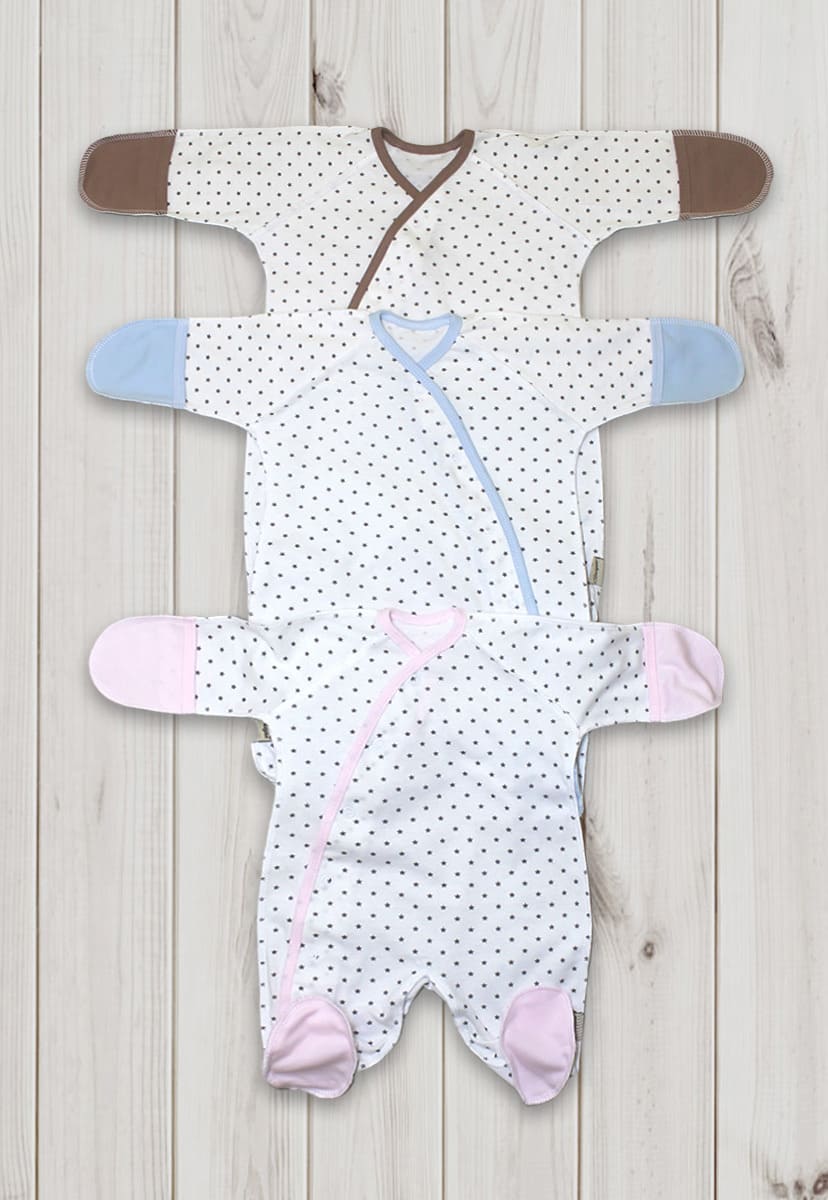 Рукава оснащены отворотами-царапками, защищающими от случайных царапин. Комбинезон доступен в размерах 50, 56 и 62 см и представлен в нежных расцветках: для мальчиков, девочек и в универсальном нейтральном варианте.