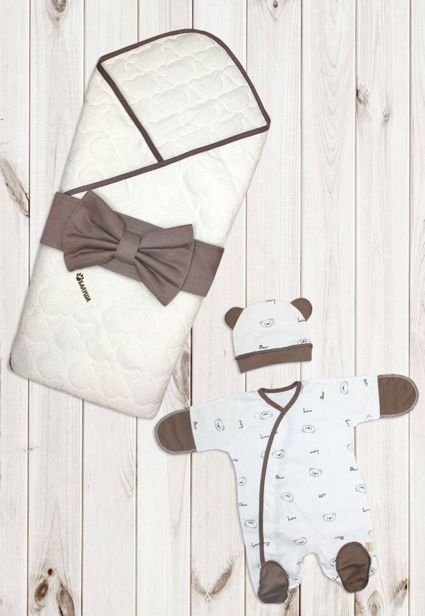 Комплект на выписку Балуша «Эколенд-3» – набор из 4 предметов, идеально подходящий для выписки в летний период. В комплект входит: плед 2-х сторонний (85х85см), комбинезон (р-р 56см), ручки аницарапки, шапочка и бант на липучке для торжественного вида.