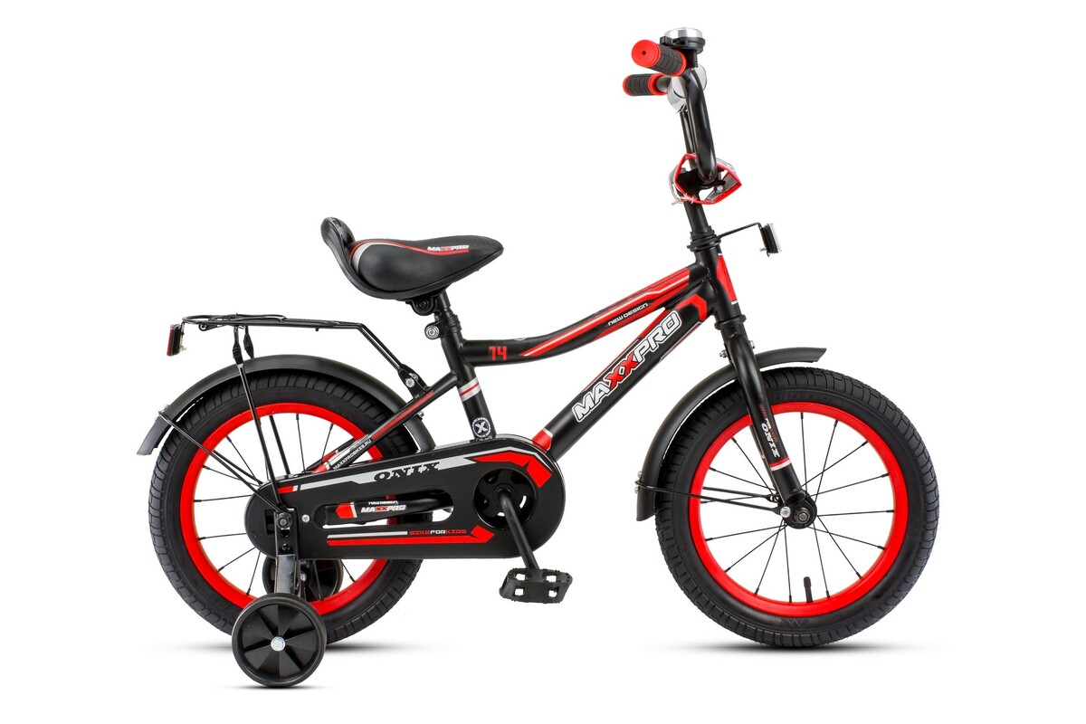 Детский двухколесный велосипед MaxxPro Onix 14 для детей от 3 до 5 лет. Он оснащён прочной стальной рамой, двумя 14-дюймовыми колесами и двумя боковыми опорными, а также ножными задними и передними ободными тормозами. Для защиты от грязи имеются крылья, а на руле установлен звонок. Сзади предусмотрен багажник для перевозки пассажиров.