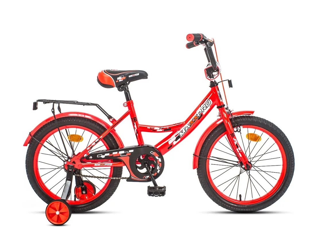 Детский двухколесный велосипед MaxxPro N18 предназначен для детей от 7 до 9 лет. Он оснащён прочной стальной рамой, двумя 18-дюймовыми колесами и двумя боковыми опорными, а также ножными задними тормозами. Для защиты от грязи имеются крылья, а на руле установлен звонок. Сзади предусмотрен багажник для перевозки пассажиров.