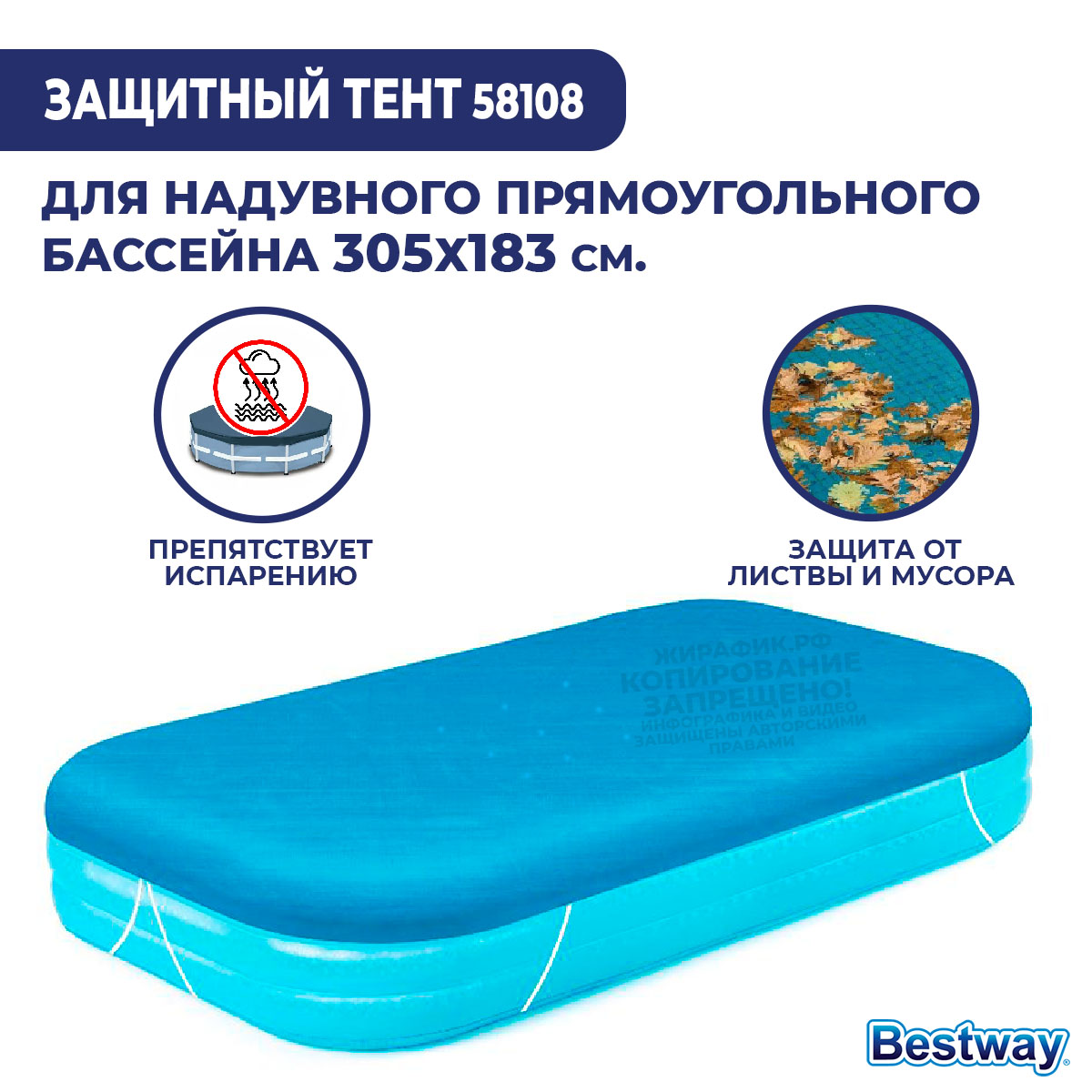 Тент Bestway 58108 предназначен для надувных бассейнов размером 305х183 см и 262х175 см. Благодаря такой форме крышке, бассейн герметично защищен от различного мусора и атмосферных осадков. Накидка выполнена из прорезиненной прочной ткани устойчивой к механическим воздействиям, исключает провисание, что не позволяет застаиваться дождевой воде. Предотвращает излишнее остывание и испарение воды.