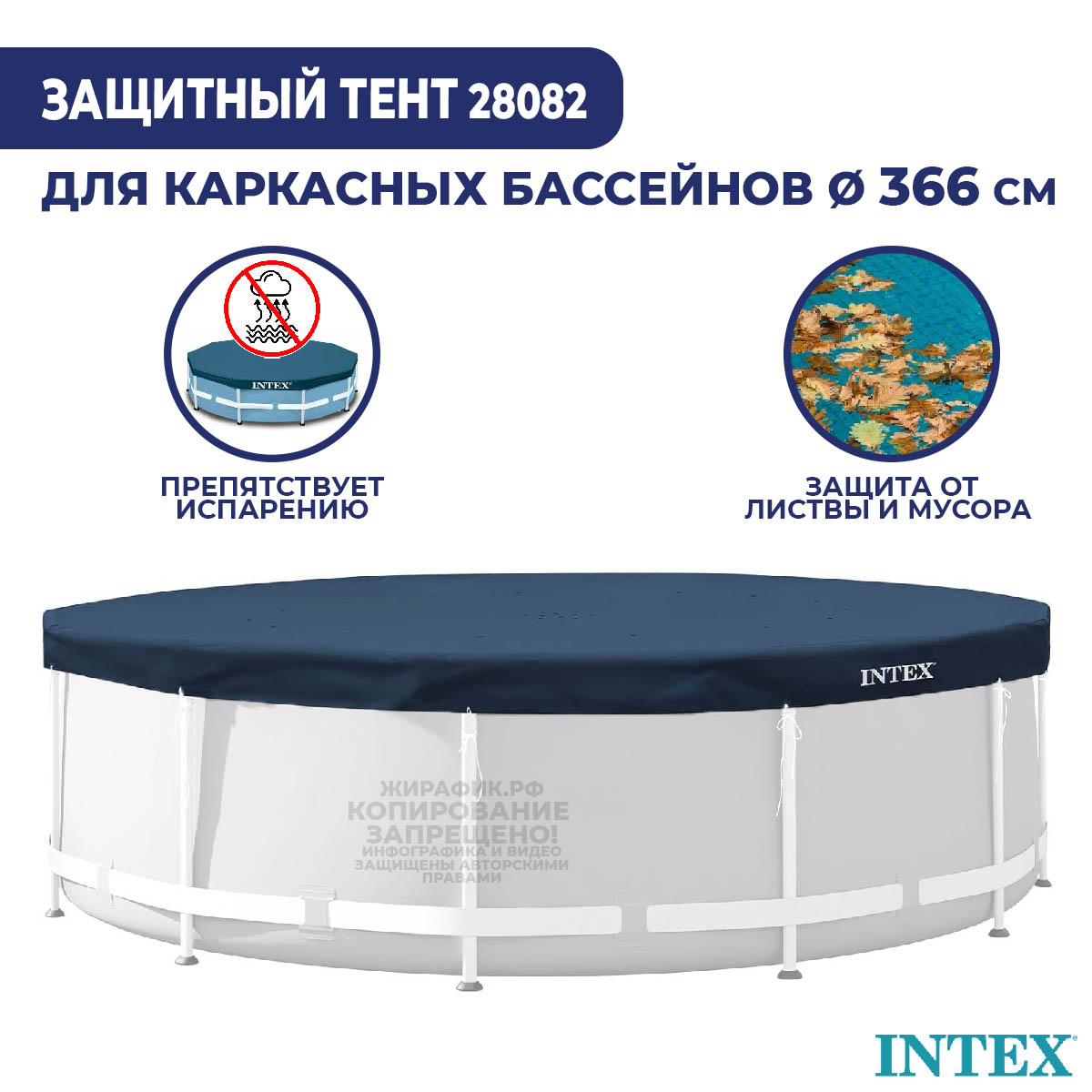 Тент 28082 предназначен для круглых каркасных бассейнов Intex и Bestway диаметром 366 см. Тент предотвращает попадание различного мусора, а также уменьшает испарение воды в бассейне.