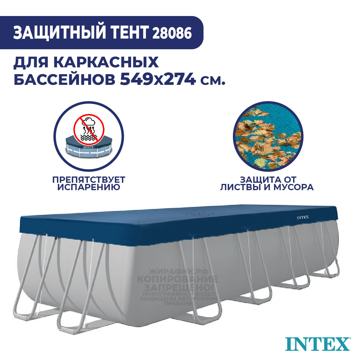 Защитный тент-накидка для каркасного бассейна Intex 28086 имеет фактический размер 536х267 сантиметра, предназначен для каркасных бассейнов прямоугольной формы размером до 549x274 см. С ее помощью можно защитить воду в бассейне от загрязнения листвой, мусором и попадания в нее дождя. В ночное время суток такая накидка предотвратит испарение и остывание воды. Чехол оснащен сливными отверстиями, через которые удаляется лишняя влага от выпадающих осадков.