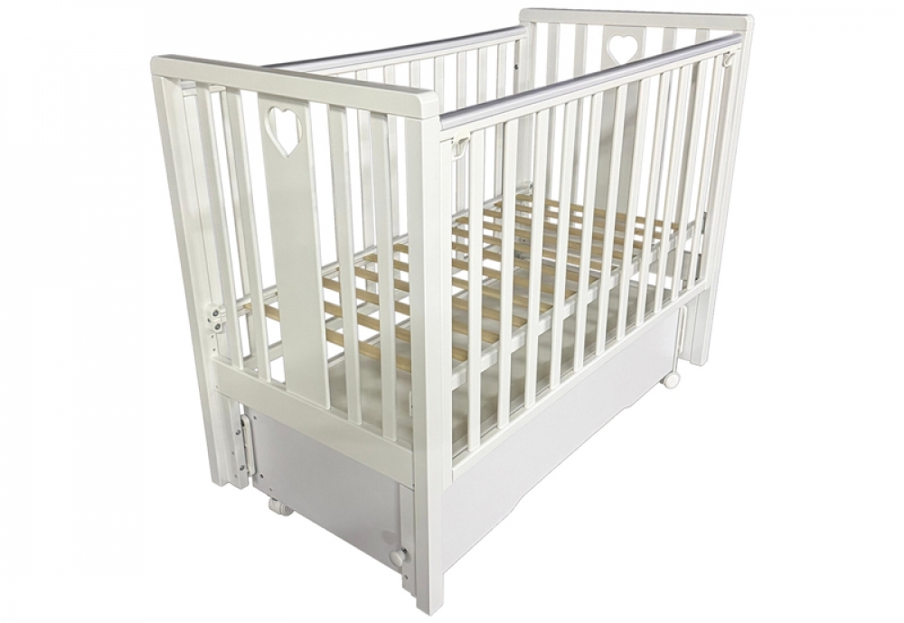 Высота реечного ложа регулируется в 3-х положениях, а боковая стенка может опускаться для уменьшения нагрузки на спину мамы. При необходимости ее можно снять. Можно устанавливать колёса под опорой маятникового качания. Внизу также имеется закрытый выдвижной ящик для вещей.